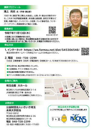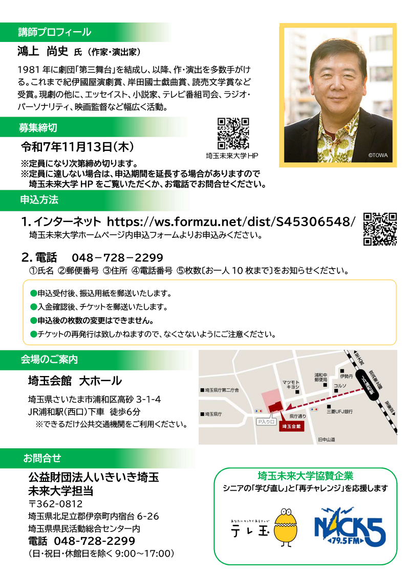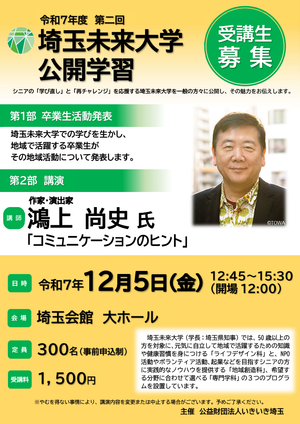 概要: | シニアの「学び直し」と「再チャレンジ」を応援する埼玉未来大学(学長:埼玉県知事 大野元裕)では、カリキュラムのうち1日を一般の方々に公開し、その魅力をお伝えするため、公開学習を開催します。 日時令和7年12月5日(金曜日)12時45分~15時30分 場所埼玉会館 大ホール 内容第1部 埼玉未来大学卒業生の活動発表第2部 講演会テーマ:「コミュニケーションのヒント」 講師:鴻上 尚史 氏(作家・演出家) 受講料1,500円 定員300名(事前申込制・先着順) 申込方法インターネット(申込フォーム)又は電話にて申し込み ※申込先等の詳細は上記URL(埼玉未来大学ホームぺージ)を御確認ください。 募集締切11月13日(木曜日)※先着順 お問い合わせ公益財団法人いきいき埼玉 未来大学担当 |