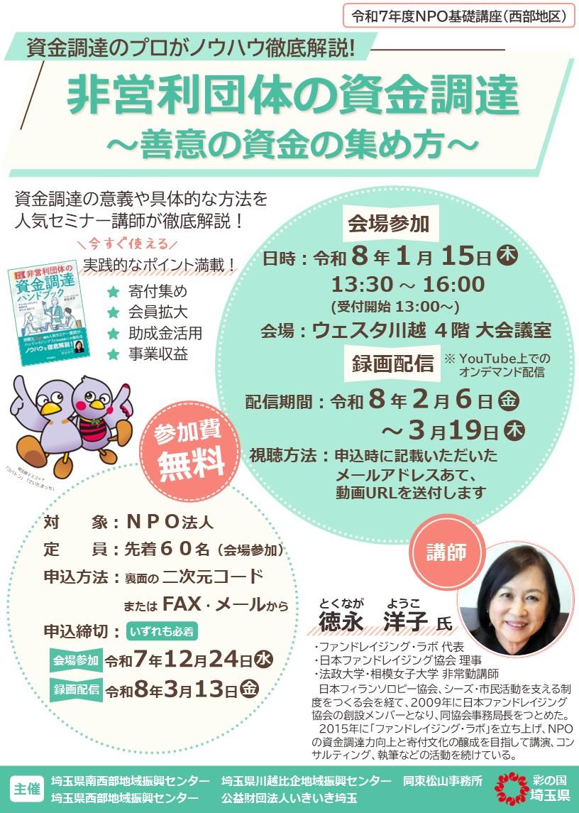 | 概要: | 南西部地域振興センター、川越比企地域振興センター、同東松山事務所、西部地域振興センターと、公益財団法人いきいき埼玉は合同で、令和7年度NPO基礎講座を開催します。 令和7年度は、受講生2万人超の人気セミナー講師、徳永洋子氏を講師にお迎えし、「非営利団体の資金調達~善意の資金の集め方~」をテーマに講座を行います。NPO法人の皆さま、ぜひご参加ください! 講座テーマ「非営利団体の資金調達~善意の資金の集め方~」 講師徳永 洋子(とくなが ようこ)氏 開催日時【会場参加】令和8年1月15日(木曜日)13時30分~16時00分 場所【会場参加】ウェスタ川越 4階 大会議室(川越市新宿町1-17-17) 費用無料 ※要申込 対象NPO法人 定員先着60名(会場参加のみ) 申込方法参加申込フォーム(https://forms.office.com/r/b60yQ1jW9u)より、申込可能です。 申込締切【会場参加】令和7年12月24日(水曜日)必着 留意事項【会場参加の方】