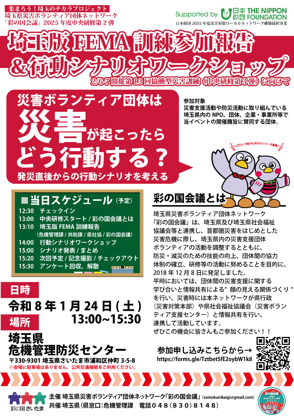 | タイトル: | 【1月24日開催】埼玉版FEMA訓練参加報告&行動シナリオワークショップ開催(主催:埼玉県災害ボランティア団体ネットワーク「彩の国会議」、共催:埼玉県) |